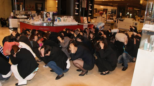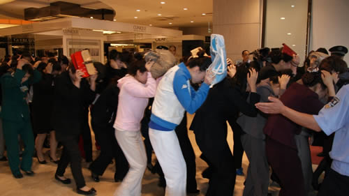 國芳百貨員工按照防震緊急避險的標準動作進行演習(xí)